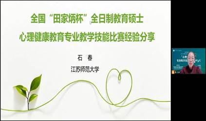 在经验分享环节,往届优秀作品指导教师,江苏师范大学石春老师进行了指导经验的交流。石老师分别对选题指导、教学设计指导和录课与模拟授课指导这三大板块内容进行了细致清楚的讲解。她指出心理健康老师备课在选题上要充分了解教材,通过逆向思维,来达到选题的新颖和有深度;在教学设计上要深耕教材并构建知识结构,同时通过巧妙设计一系列教学活动来促进学生对知识的理解;在录课和模拟指导上要优化自己的课件内容、教学要提供真实的情景,做到教学入“境”,以镜为“境”。